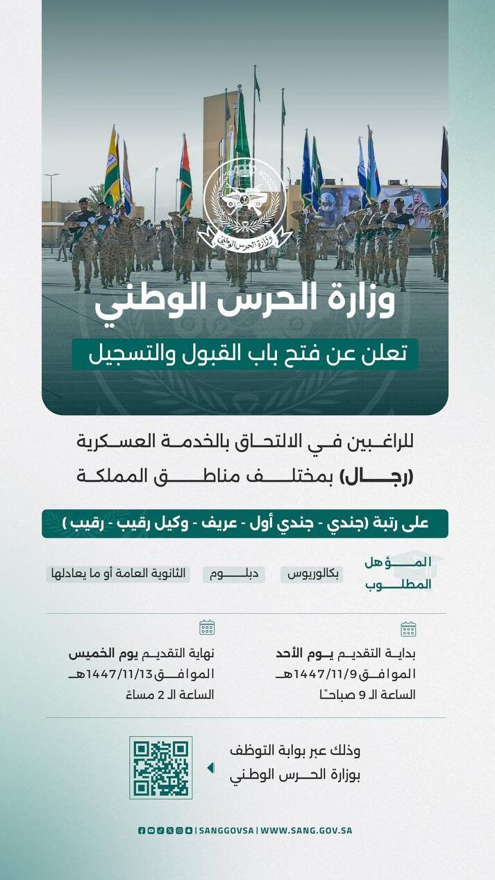 تعلن #وزارة_الحرس_الوطني عن فتح باب القبول والتسجيل للراغبين في الالتحاق بالخدمة العسكرية في مختلف مناطق المملكة (تجنيد – رجال)، ابتداءً من يوم الأحد الموافق 09/11/1447هـ حتى يوم الخميس الموافق 13/11/1447هـ.