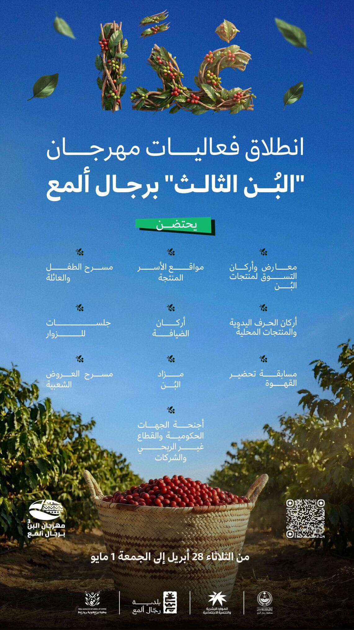 تستعد محافظة رجال ألمع لاستقبال النسخة الثالثة من مهرجان البن، في حدث يمتد لأربعة أيام بداية من الثلاثاء 28 أبريل، ليضع المنطقة في قلب مشهد متنامي يعكس الاهتمام المتزايد بزراعة البن وتعزيز حضوره كمنتج اقتصادي وثقافي يعبر عن هوية الجنوب السعودي.